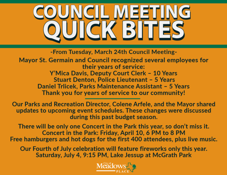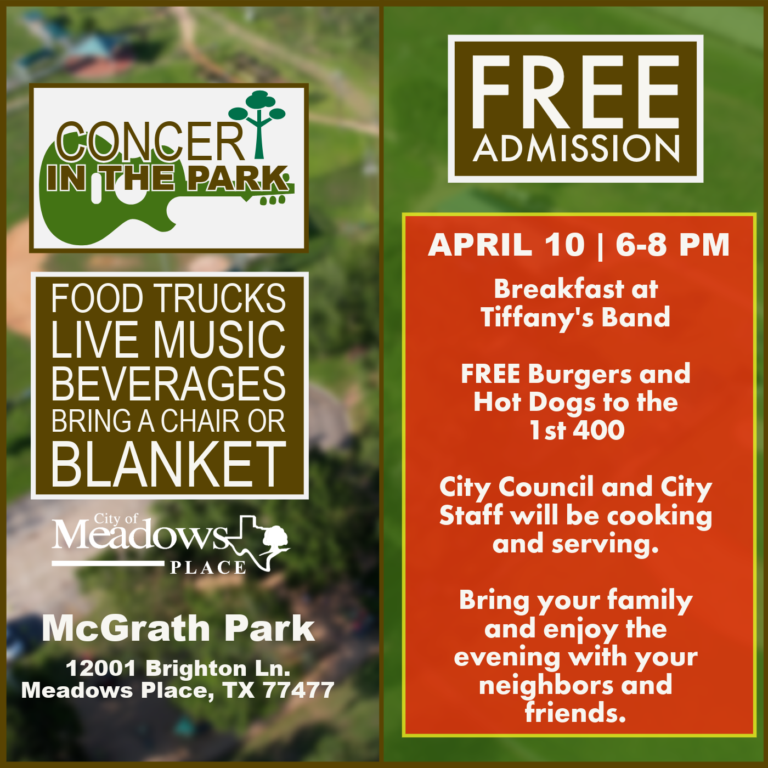 Discover Meadows Place Online Payments Election Information Permits & Licenses Code Enforcement Employment Ask A Question City Directory Online Payments Election Information Permits & Licenses Code Enforcement Employment Report A Concern City Directory Police Parks & Recreation City Updates Stay Up To Date Latest News Community Events Project Updates Crochet Class – Texture 101 Summer Nature Camp 2026 Registration is Open COUNCIL QUICK BITES | MARCH 24, 2026 Crochet Class – Texture 101 COUNCIL QUICK BITES | MARCH 24, 2026 Concert in the Park Coming Up Spring Into Improvements! Fiber Optics Installation Notice Traffic Alert Eastbound W. Airport Blvd. View All News Calendar Upcoming Meetings and Events View Full Calendar