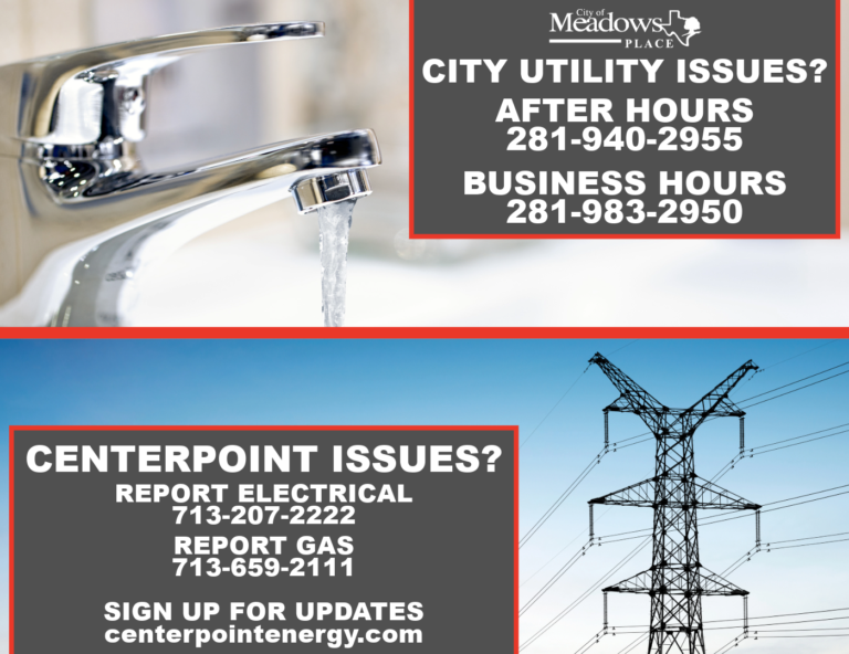 Discover Meadows Place Online Payments Election Information Permits & Licenses Code Enforcement Employment Ask A Question City Directory Online Payments Election Information Permits & Licenses Code Enforcement Employment Report A Concern City Directory Police Parks & Recreation City Updates Stay Up To Date Latest News Community Events Project Updates The Pantry Project at City Hall Utilities Update and Important Numbers An Afternoon with Crossing Guard, Ms. Rita, Mic’d Up 9th Annual Family Campout Memories Made at Daddy Daughter Date Night Learn to Crochet Traffic Alert Eastbound W. Airport Blvd. Aeration Basin Clean Out at the Wastewater Treatment Plant Improvements Being Made Around the City View All News Calendar Upcoming Meetings and Events View Full Calendar