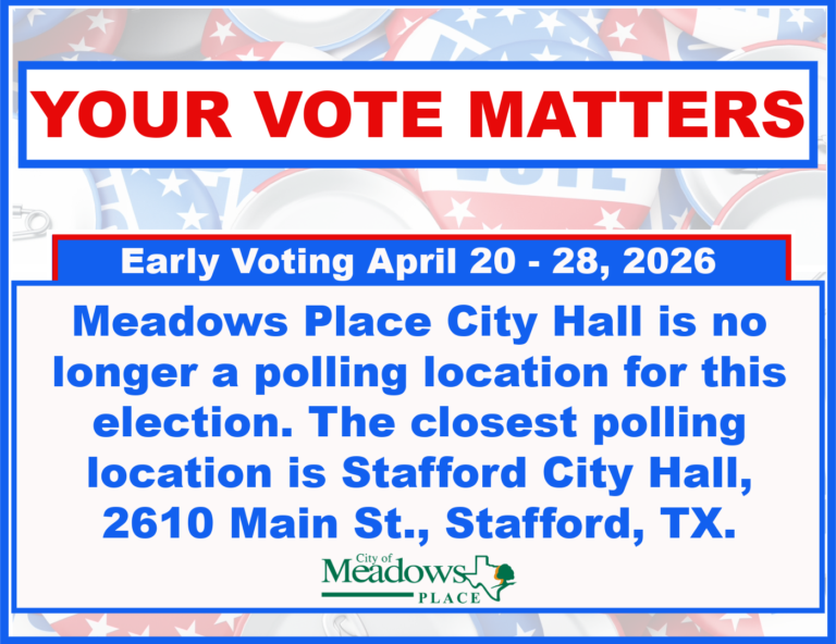 Discover Meadows Place Online Payments Election Information Permits & Licenses Code Enforcement Employment Ask A Question City Directory Online Payments Election Information Permits & Licenses Code Enforcement Employment Report A Concern City Directory Police Parks & Recreation City Updates Stay Up To Date Latest News Community Events Project Updates Concert in the Park Rescheduled: Friday, April 24 Helfman Playground for All UPDATE Concert in the Park Cancelled Concert in the Park Rescheduled: Friday, April 24 Concert in the Park Cancelled Plant Potting Party Helfman Playground for All UPDATE Spring Into Improvements! Fiber Optics Installation Notice View All News Calendar Upcoming Meetings and Events View Full Calendar