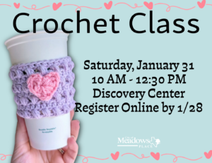 Are you looking for a unique handmade Valentine’s gift? Join us Saturday, January 31. In this class, you’ll crochet a Valentine cup sleeve with an embroidered heart. Everything is included: