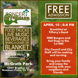 Join us for our next event: Concert in the Park, Friday, April 10, 6PM – 8PM. There will be live music from Breakfast At Tiffany’s Band and City Council and