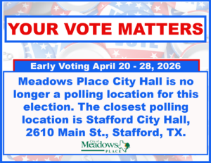 Meadows Place City Hall is not a polling location for this election. The closest polling location is Stafford City Hall, 2610 Main St., Stafford, TX. Check out the website below