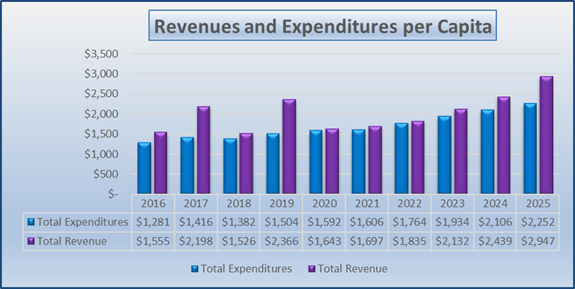 The following charts display the total revenue and expenditures for the City as well as the per capita revenue and expenditures for the past 10 fiscal years. The City’s fiscal year begins October 1 and ends the following year on September 30.