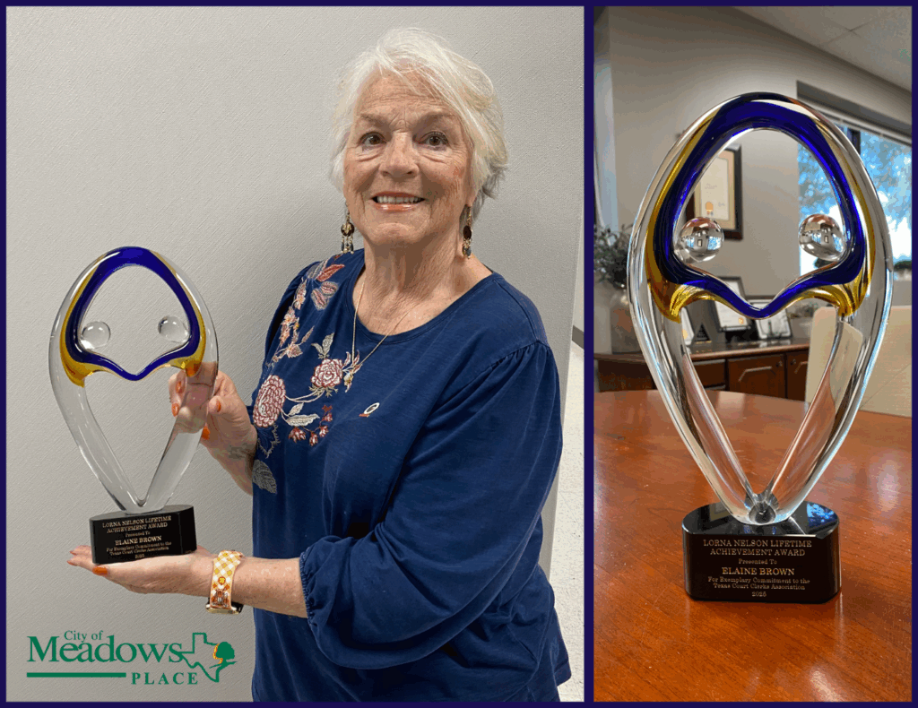 Elaine Brown, better known as Ms. Elaine, assists our courts department with court collections and training and procedures. However, she has been involved in the Texas court system for many years in several capacities. The Texas Court Clerks Association recognized her contribution by awarding her the Lorna Nelson Lifetime Achievement Award for Exemplary Commitment to the Texas Court Clerks Association. Ms. Elaine is only the 10th person to receive this award since the association began in 1972. During the presentation of the award, she was described by her colleagues as “Kind, steadfast, and generous with her time and wisdom…she continues to guide and uplift others.”