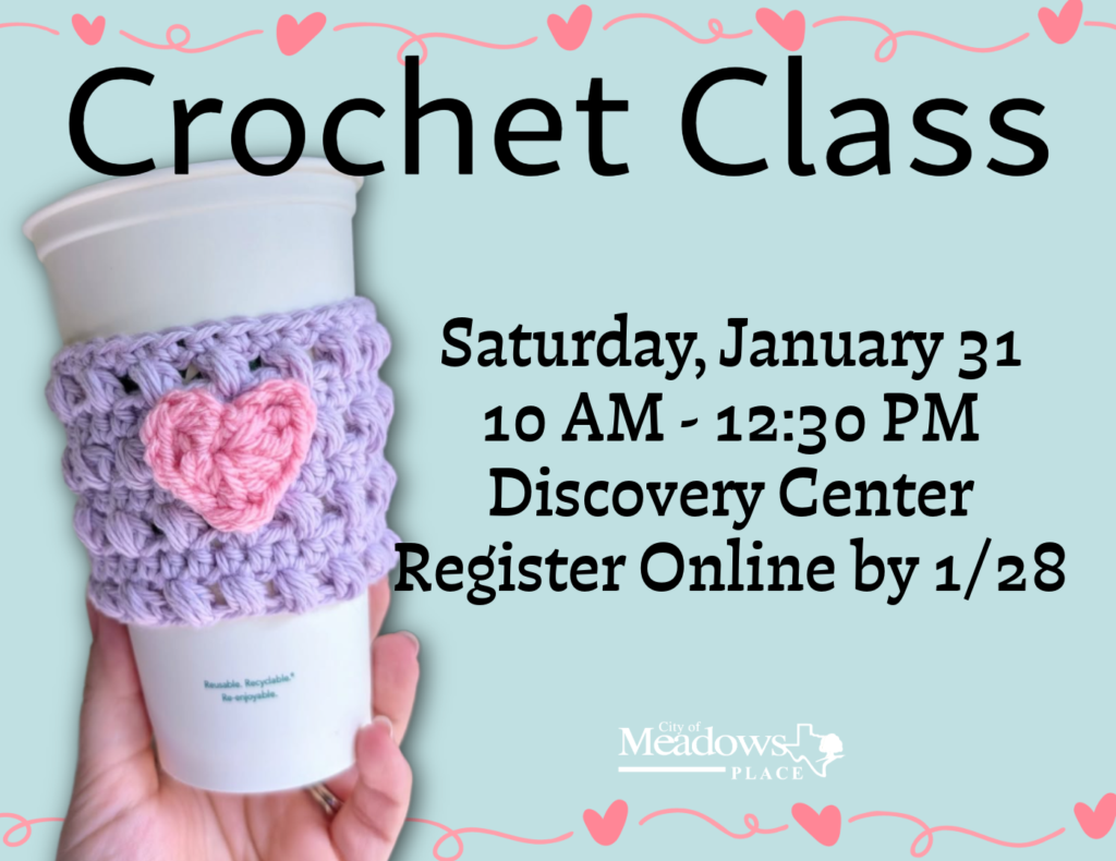 In this class, you’ll crochet a Valentine cup sleeve with an embroidered heart. Everything is included: instruction, supplies, Valentine treats, and a take-home cup sleeve.