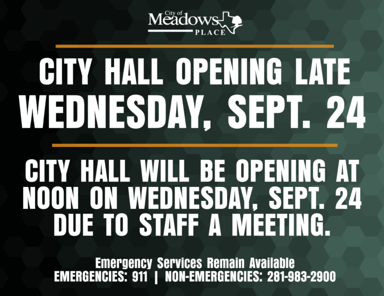 21October 21, 2025●(1 event) City Council Special Meeting This site is accessible to disabled individuals. For special assistance, please contact the City Secretary at (281) 983-2931 prior to the meeting so that appropriate arrangements can be made. The City of Meadows Place is committed to compliance with the Americans with Disabilities Act. |