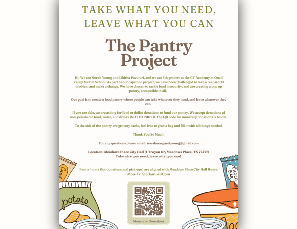 Two Quail Valley Middle School students have set up a pop-up pantry inside City Hall as part of their capstone project. Their goal: “๐ค๐ณ๐ฆ๐ข๐ต๐ฆ ๐ข ๐ง๐ฐ๐ฐ๐ฅ ๐ฑ๐ข๐ฏ๐ต๐ณ๐บ ๐ธ๐ฉ๐ฆ๐ณ๐ฆ ๐ฑ๐ฆ๐ฐ๐ฑ๐ญ๐ฆ ๐ค๐ข๐ฏ ๐ต๐ข๐ฌ๐ฆ ๐ธ๐ฉ๐ข๐ต๐ฆ๐ท๐ฆ๐ณ ๐ต๐ฉ๐ฆ๐บ ๐ฏ๐ฆ๐ฆ๐ฅ, ๐ข๐ฏ๐ฅ ๐ญ๐ฆ๐ข๐ท๐ฆ ๐ธ๐ฉ๐ข๐ต๐ฆ๐ท๐ฆ๐ณ ๐ต๐ฉ๐ฆ๐บ ๐ค๐ข๐ฏ.”
